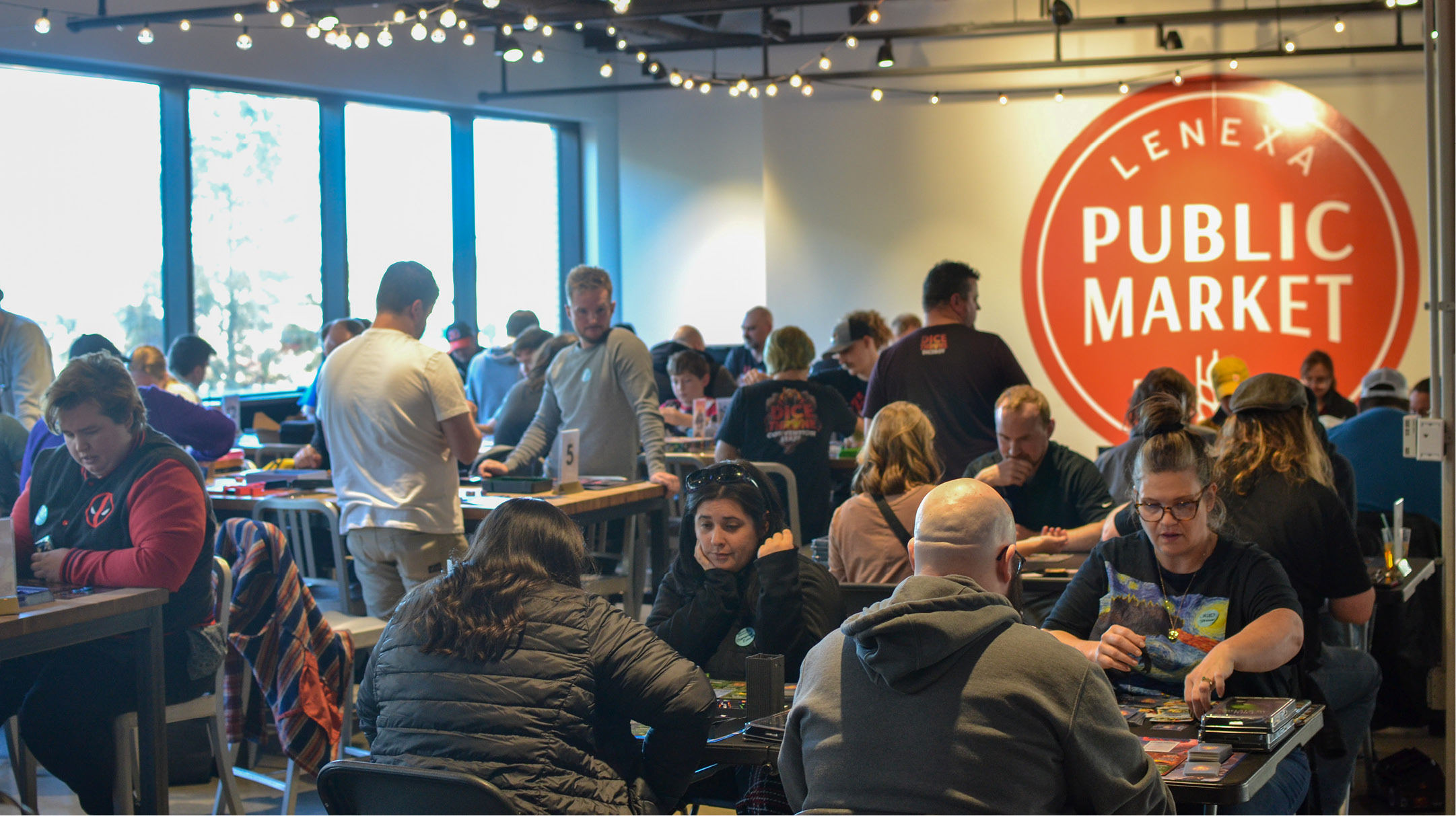 Group of participants playing in Dice Throne Tournament at the Lenexa Public Market